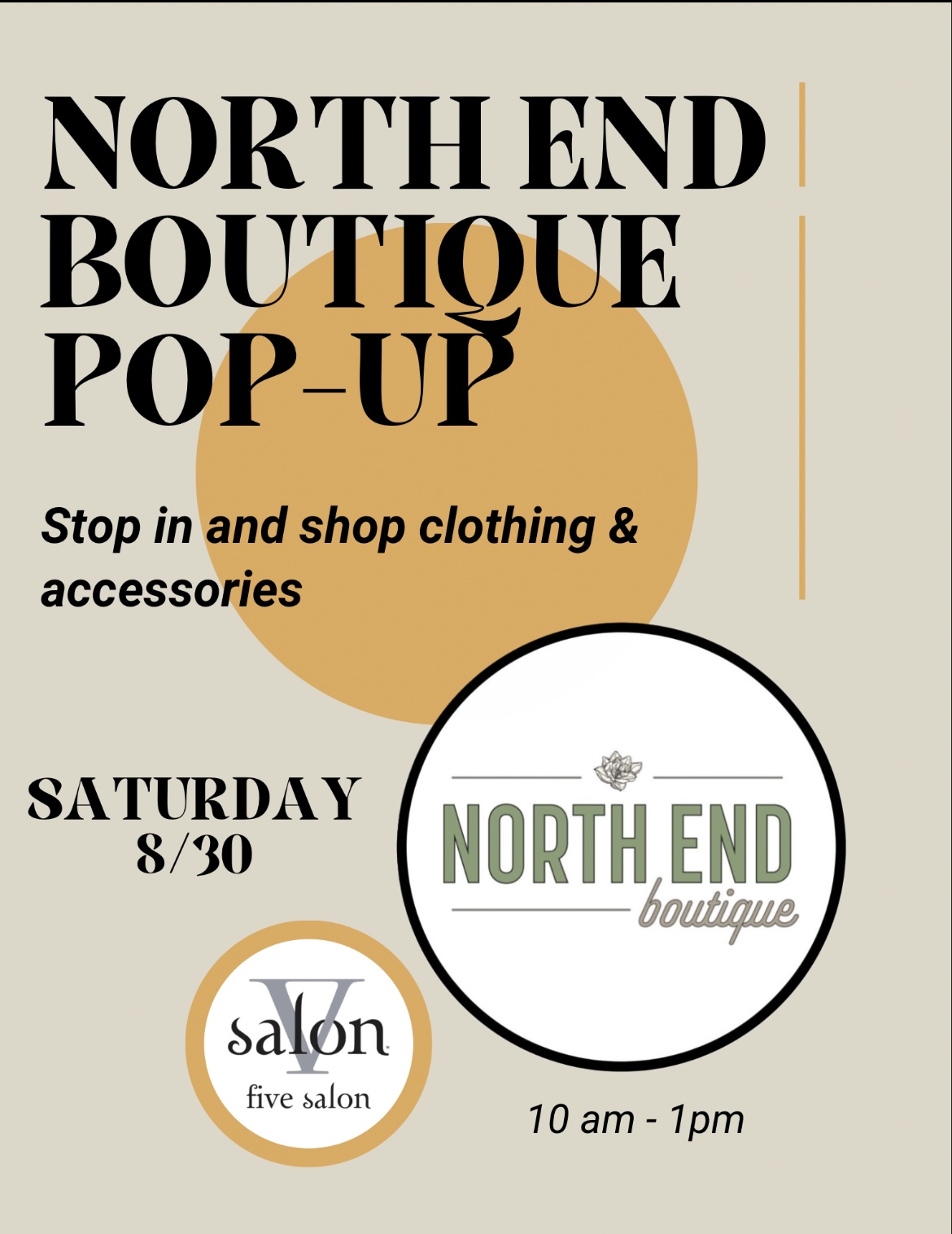 Join us this Saturday, 8-30 from 10am-1pm @ Five Salon. Shop for clothes & accessories and your favorite Aveda products! See you Saturday!