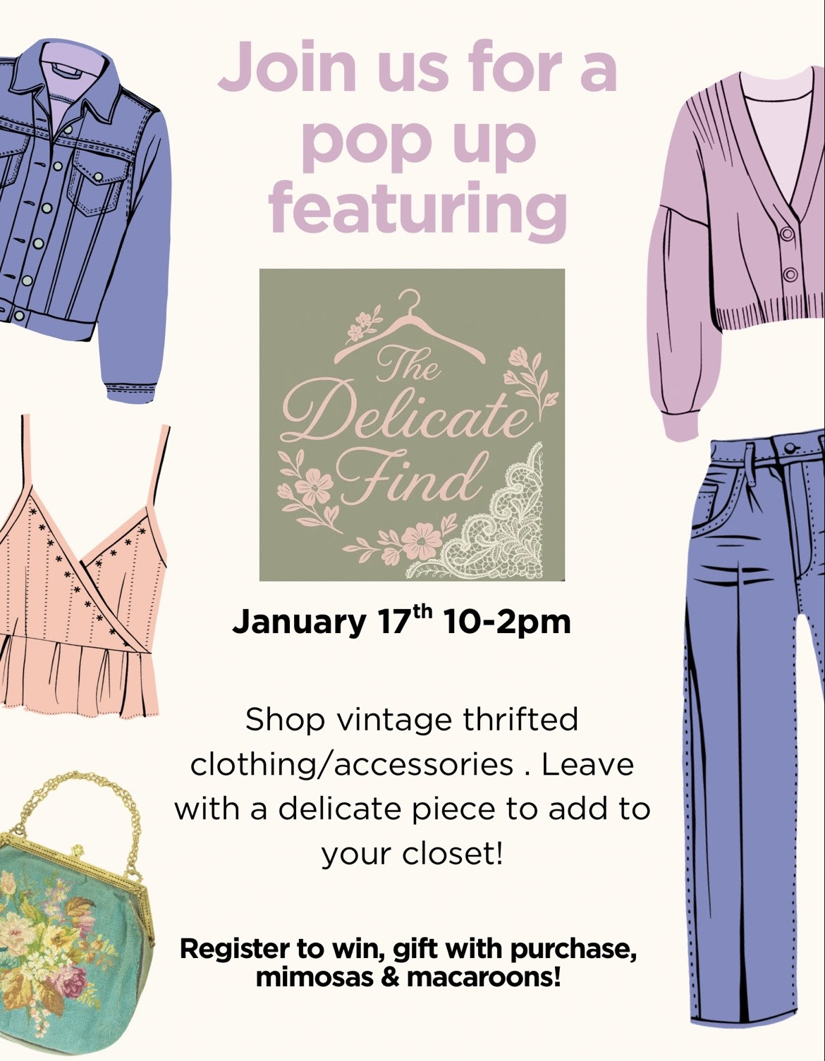 Stop in this Saturday for our Pop up event @ Five Salon with Delicate finds from 10-2 pm. Shop vintage clothing & accessories while sipping on mimosa, macaroons and picking up your fav Aveda products. See you Saturday!